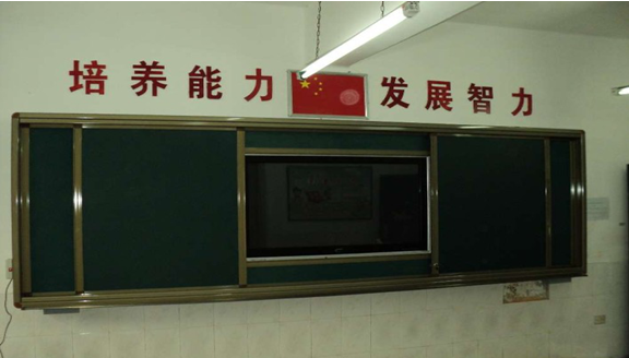 2. 外滑軌裝置:安裝兩塊移動綠板,兩綠板尺寸之和與內(nèi)軌道白板的尺寸一致;進行常規(guī)教學時,可將此綠板滑動到液晶電視前方,保護液晶觸摸一體機,增大書寫面積;進行多媒體教學時,將綠板拉開,使用液晶觸摸一體機。